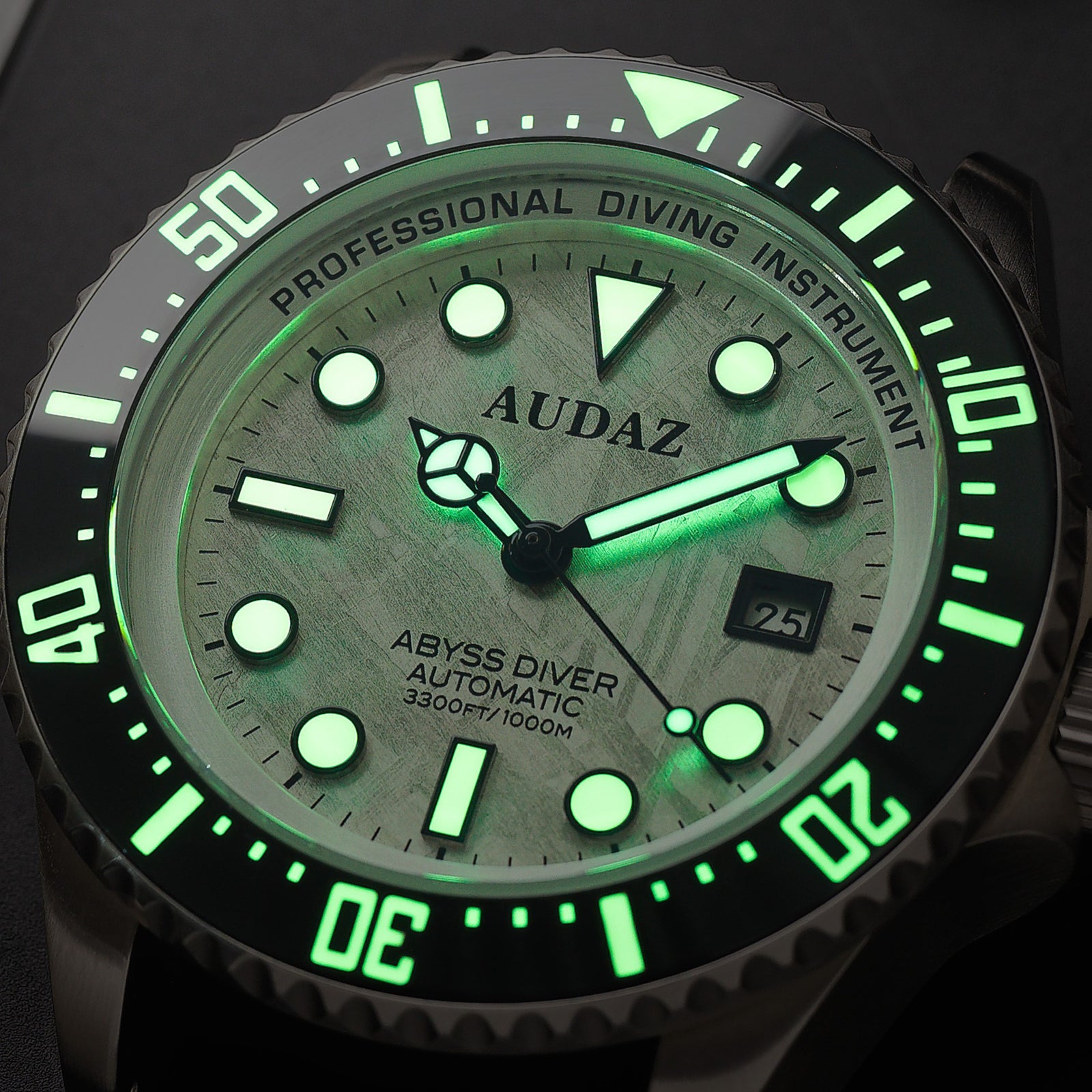 The Abyss Diver - Meteorite dial features a unique watch face crafted from Muonionalusta meteorite from Sweden. Each dial showcases an unreplicable Widmanstätten pattern, offering a one-of-a-kind connection to outer space, making this timepiece a striking addition to any collection.