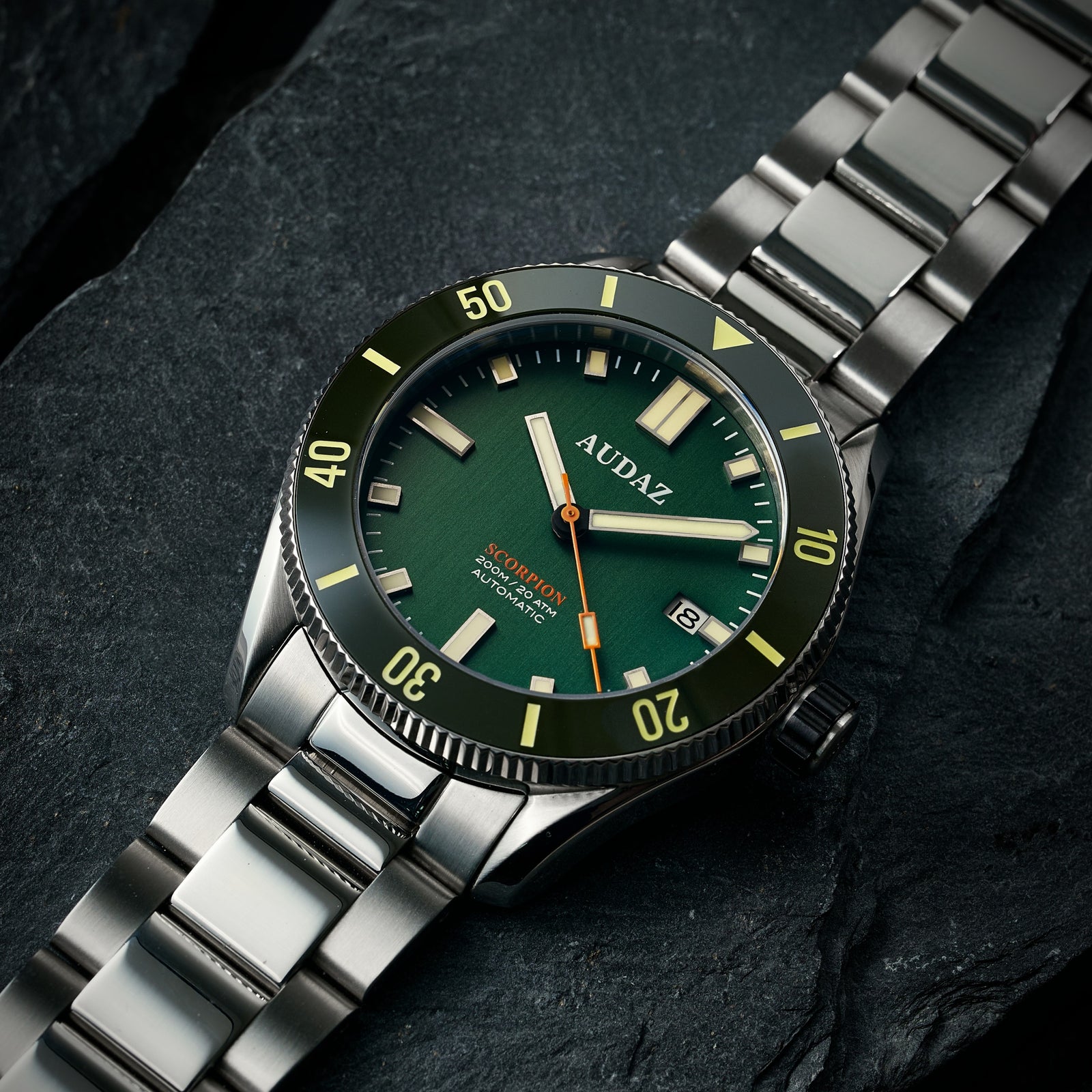 Imbued with a minimalist elegance, the Scorpion dive watch showcases a harmonious balance of clean lines, classic color combinations, and an abundance of the finest C3 grade Swiss Super-LumiNova. This masterful combination culminates in immaculate dials that exude exceptional legibility, ensuring effortless reading even in low light conditions.