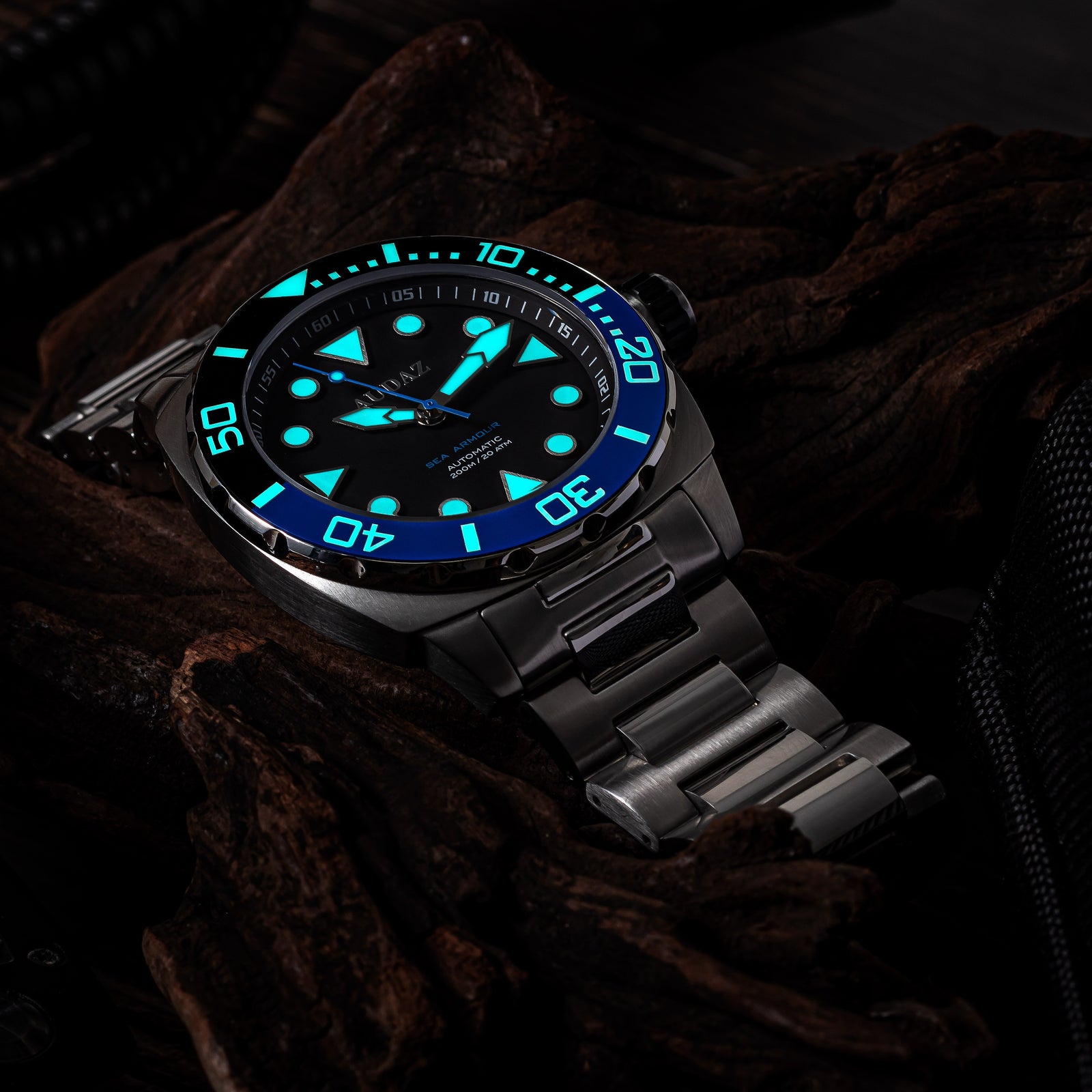 Legibility in low-light conditions is essential for divers, and the Sea Armour dive watch delivers exceptional visibility. Its clean, immaculate dial features large hands and applied indexes filled with blue glowing Swiss Super Luminova, ensuring readability in any environment.